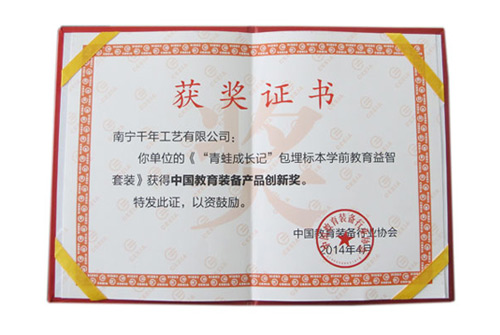 由南寧千帆教學科技有限公司設計,聯合南寧千年工藝有限公司共同研發的“千帆”品牌包埋標本學前教育益智產品--《青蛙成長記》,榮獲中國教育裝備產品創新獎。產品在設計上大膽創新,引入“與孩子共享自然”的教育理念,得到評審專家的一致認可。