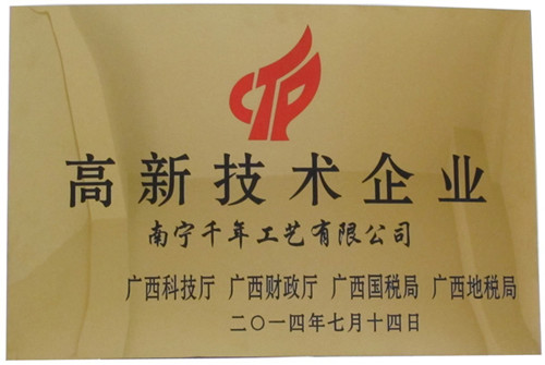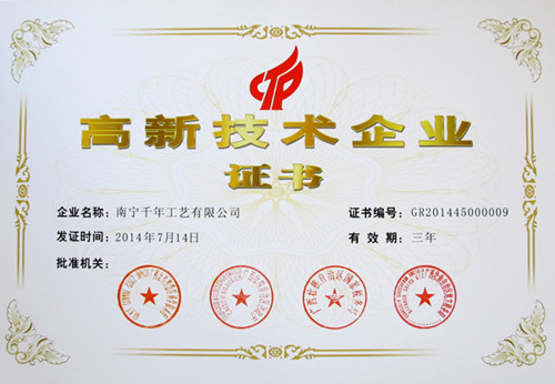 (本網訊) 熱烈慶祝集團公司------千年工藝獲得了由廣西科技廳、廣西財政廳、廣西國稅局、廣西地稅局聯合頒發的“高新技術企業證書”,成為廣西2014年首批國家級高新技術企業之一。