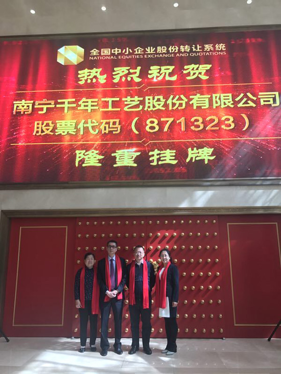 2017年5月5日,在北京金融街金陽大廈內,隨著開市寶鐘的敲響,南寧千年工藝股份有限公司(企業簡稱:千年工藝,股份代碼:871323)在全國中小企業股份轉讓系統成功掛牌上市,成為廣西首家正式登陸新三板資本市場的工藝制造企業,這是總公司在發展進程中的一個重大里程碑!