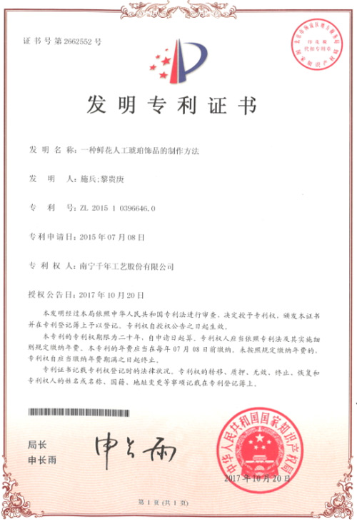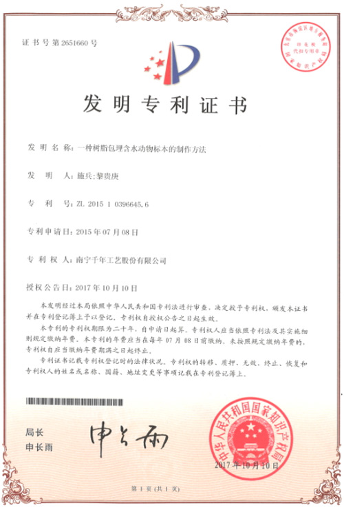 近日,集團總公司千年工藝申請的《一種樹脂包埋含水動物標本的制作方法》和《一種鮮花人工琥珀飾品的制作方法》順利通過國家知識產權局頒發國家發明專利證書。