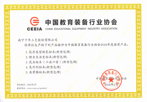 通過專家評委層層篩選,南寧千年工藝股份有限公司生產的“千帆”品牌新型包埋標本:花序類型保色標本(新型包埋)、蝗蟲生活史標本(新型包埋)、昆蟲標本(六害六益)(新型包埋)、兔外形標本(新型包埋)、魚骨骼標本(新型包埋),共5款產品榮獲中國教育裝備行業協會2018年度推薦產品。